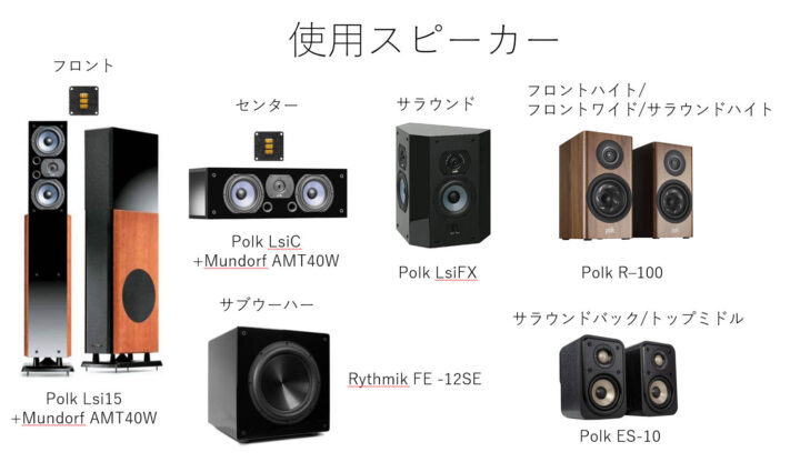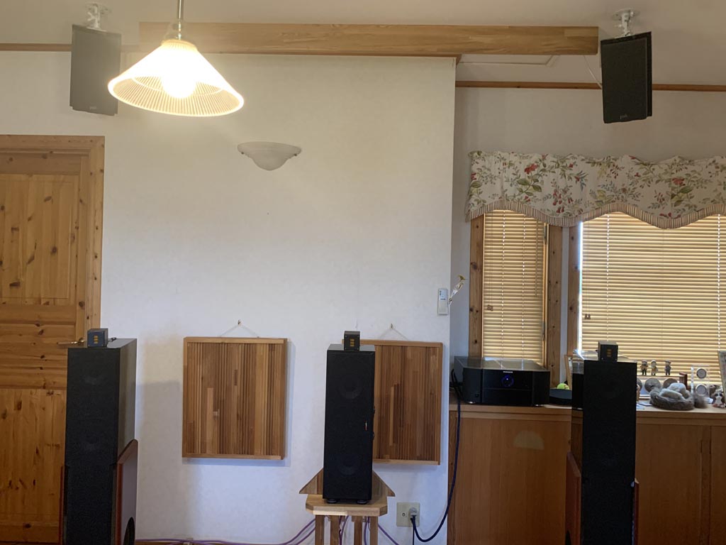 拙宅の現在のメインになっているAuro-3D仕様の2Fシアターをご紹介します。1Fには嘗てから使用している2chシステムもありますが、今回は2Fシアターのご紹介にとどめます。センターSPの置台を含めた形がロケットに似ていないこともないので、「ロケットシアター」と命名しました(笑)。SPは最近は日本でも販売しているPolk Audioのものを使っています。2世代前のLsiシリーズと現在のRシリーズで構成しています。クロスオーバーのパーツ(コンデンサと抵抗)は良いものに換装して、LCRにはMundorfのエアーモーション型スーパーツイーターを追加しています。