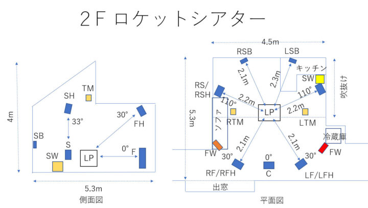 ロケットシアターでは、SPは試聴位置からの距離をほぼ等距離になるよう設置しています。但し、ハイトSPは1F層のSPの上なので、少しLPから離れます。これが大きな特徴と言っても良いかもしれません。