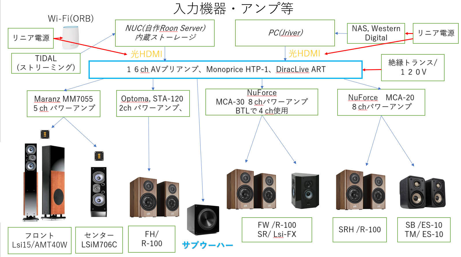 入力機器はRoonサーバーとして小型PCのNUCにROCKを導入したものを使用して、PC(windows)のJriverと併用しています。プリアンプはMonopriceのHTP-1で、最近、DiracLiveのARTが導入できるようになりましたので、ARTの補正を使った再生をしています。アンプはMaranz、Nuforce、Optomaの混成部隊。