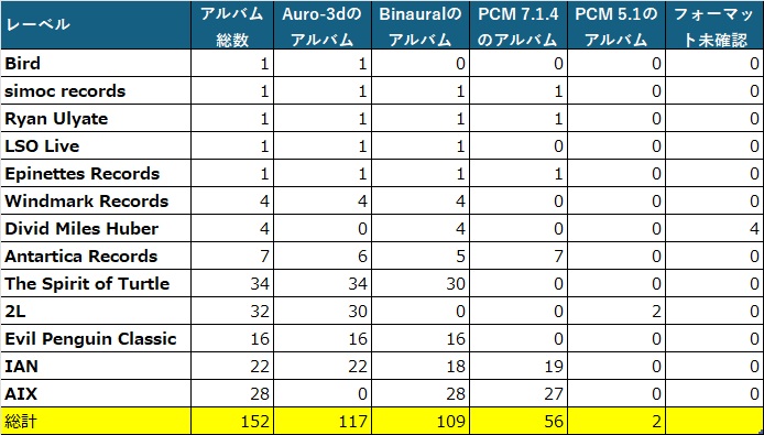 donguriは、Auro-3Dフォーマットのアルバム、上記中のレーベルのものでは、2Lが12タイトル, The Spirit of Turtleが8タイトル、IAN Recordsが6タイトル所有していることが今回判明。ファンのわりに投資が足らないと叱らないでください。したがって、117-12-8-6=91タイトルが未購入です。これを全部買ったら、ざっくり平均1アルバム4,000円としても、364,000円ですので、サブスク年額払っても、個別購入の10分の1ほどのコストとなり、お徳!ということにはなります。