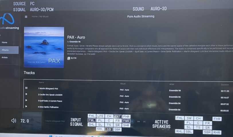 最近、Facebook のイマーシブオーディオ同好会のスレッドでNVIDIA SHIELD TV ProでのArtist Connectionアプリ経由USB DACに接続という環境ではAuro-3Dの再生に不具合が出たという報告がありましたが、donguriGoogle Chrome on Windows 11からの再生では特に問題は起こっておりません。