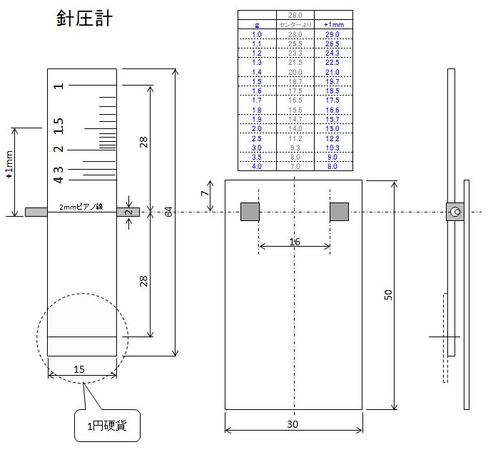 そこで電池不要の1円硬貨【1g】を利用した天秤式の針圧計を作りました。