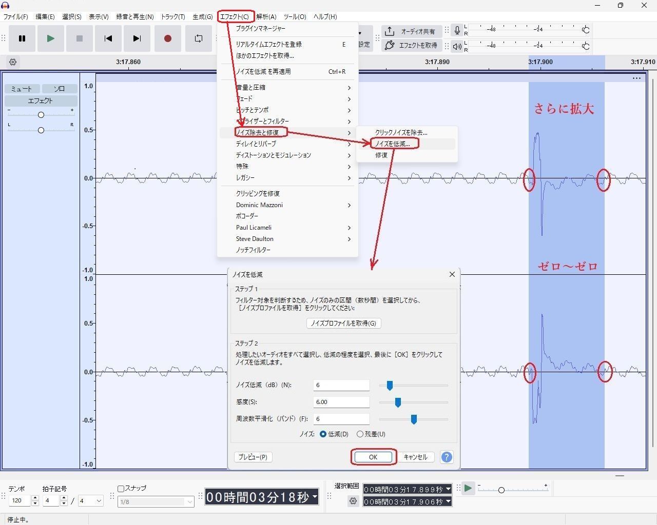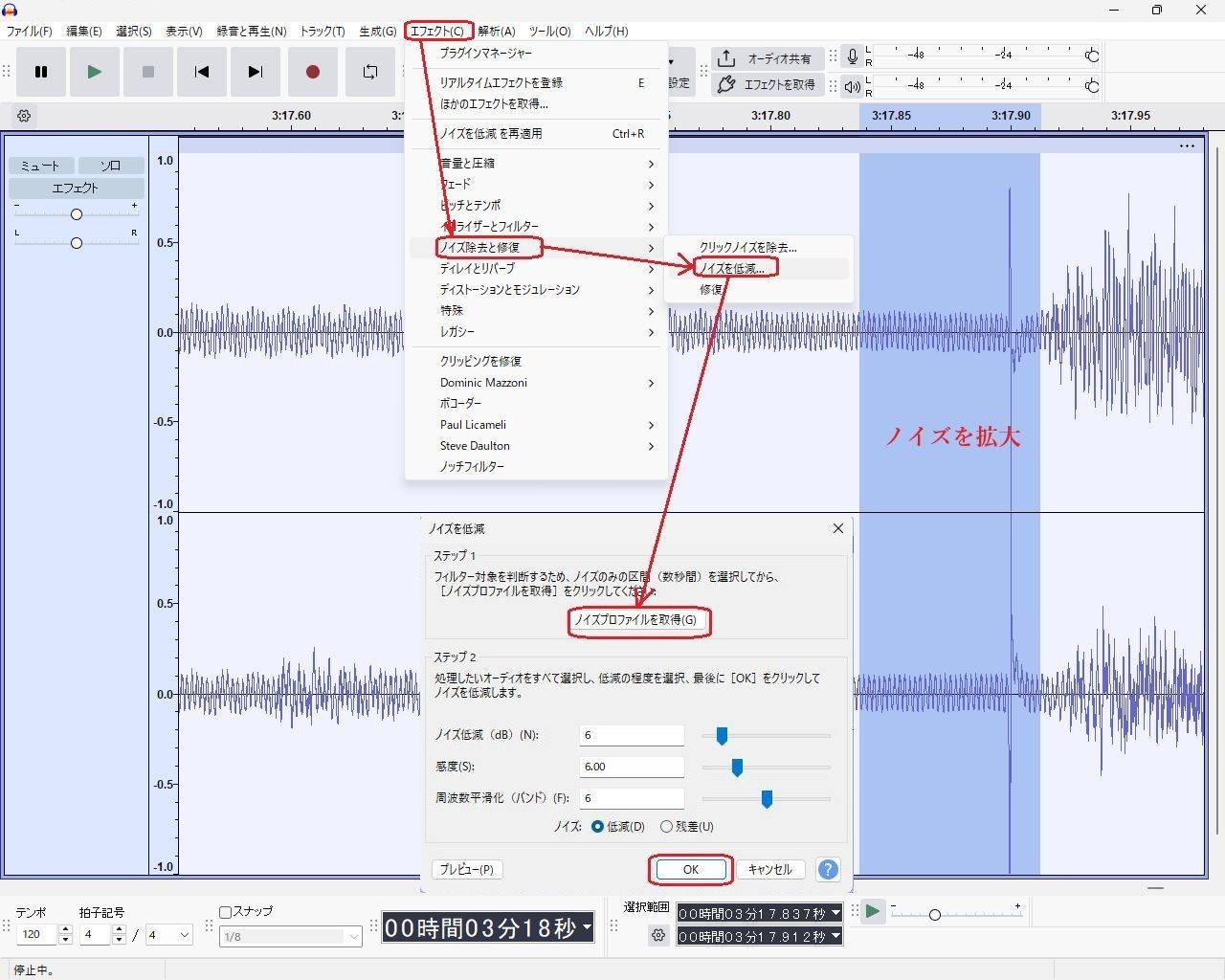 この方法は特定のノイズを狙い撃ちで消せて他の部分に影響が出ないのが良いです。