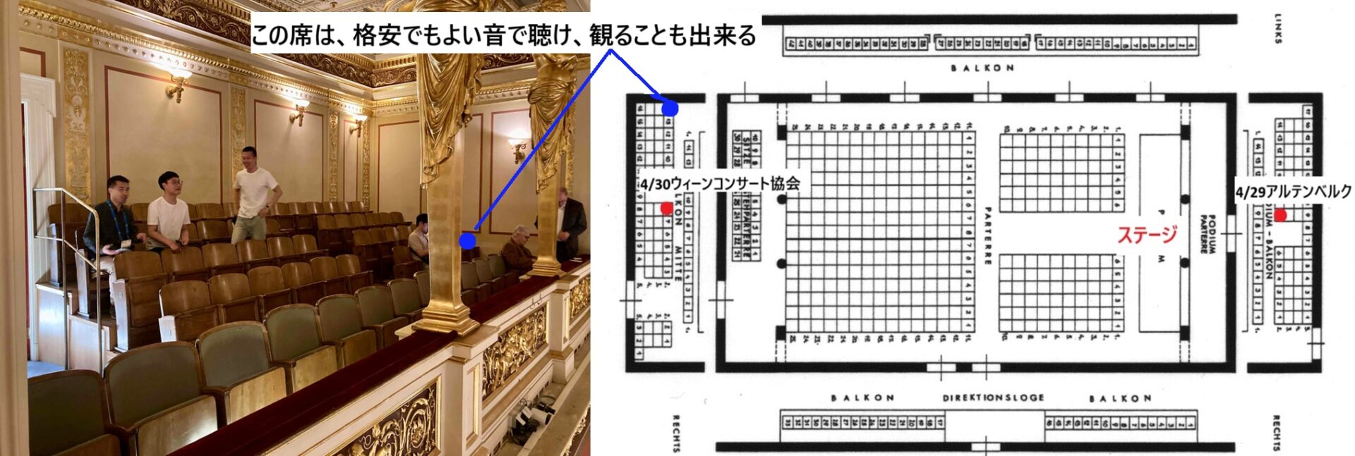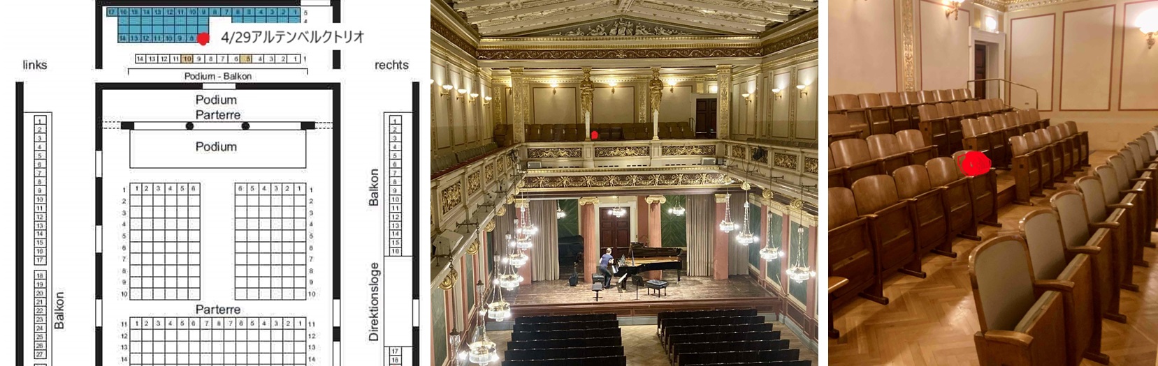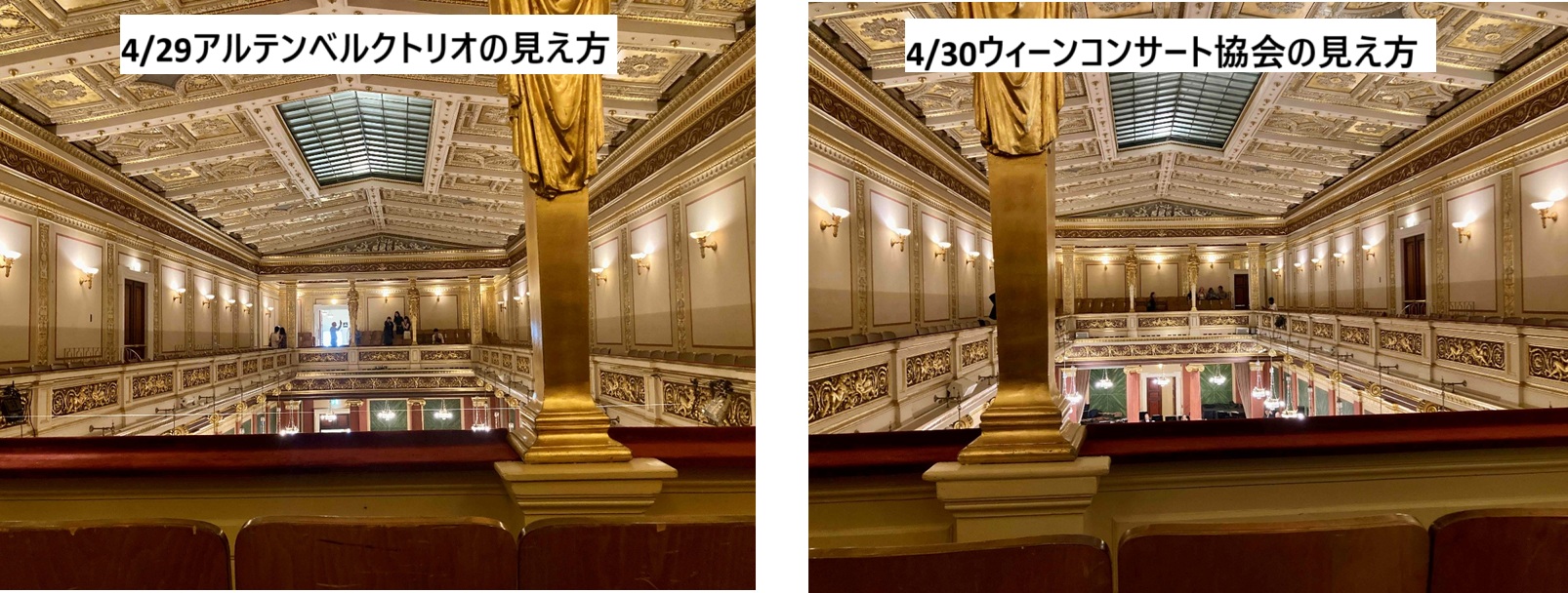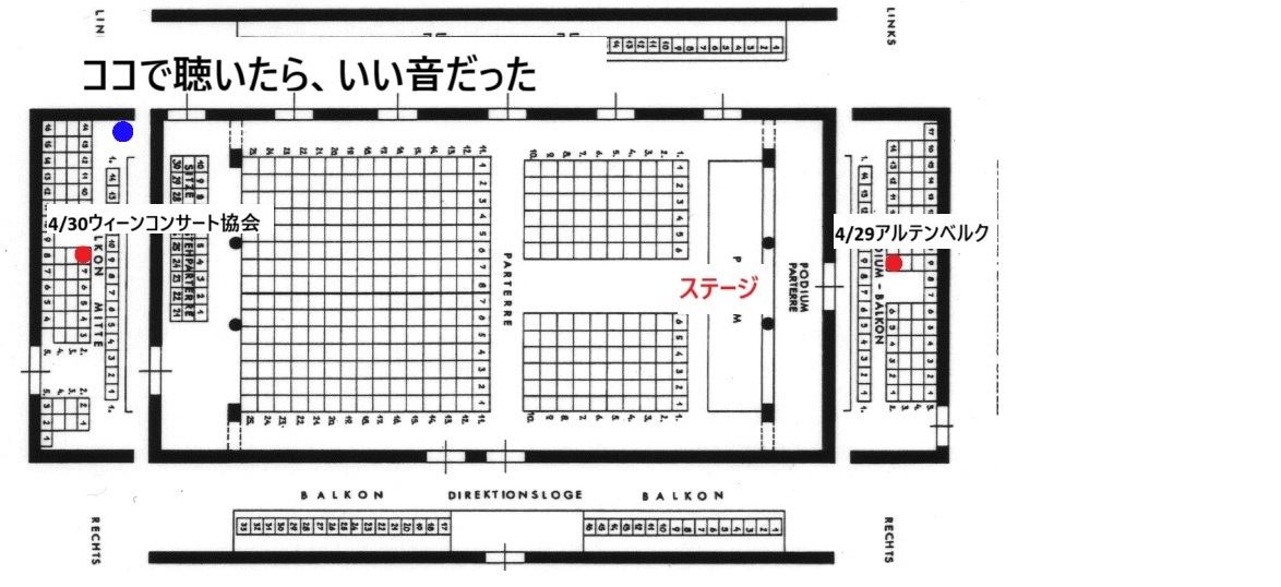この結果から、ムジークフェライン小ホールは、2階席の後方の音がいいという新たな認識が生まれました。ちょうど翌日の夜は、同じホールの2階席の後方の激安席を選択していましたので、タイミングよく検証が出来ます。