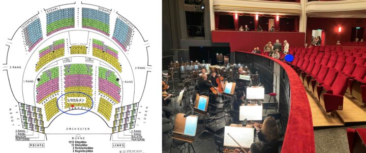 オケピットを挟んで、舞台を観るのに遮るものはありませんし、歌手の歌声もオーケストラの演奏もよく聞こえます。字幕を見たいときは見にくいのですが、演目が”カルメン”なので問題なかったです。フォルクスオーパーの舞台は、国立歌劇場の舞台と比べると親しみやすく、笑いも湧いていました。聴き馴染みのある音楽は変わりはありませんので、この席で聴く生音は身体にビンビンと響いてきます。