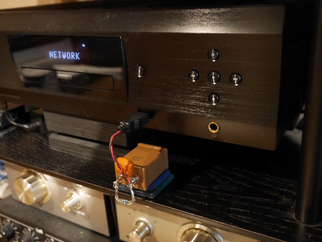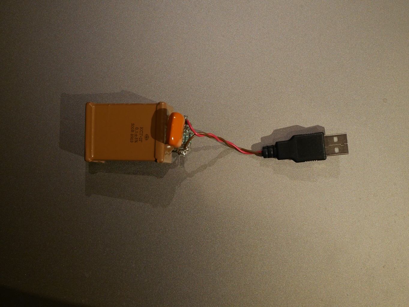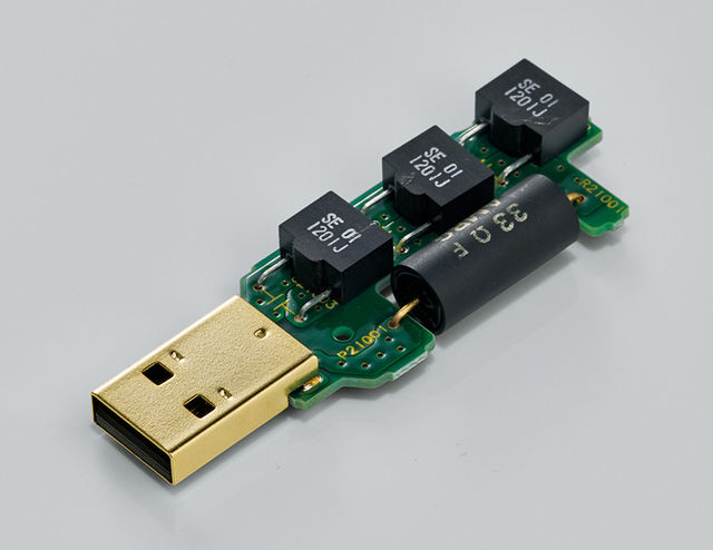 下の写真はその試作品。USBコネクター内にコンパクトに収められたオレンジ色の680pFのポリプロピレン・コンデンサが見えます。この配置が効果的だったかもしれません。