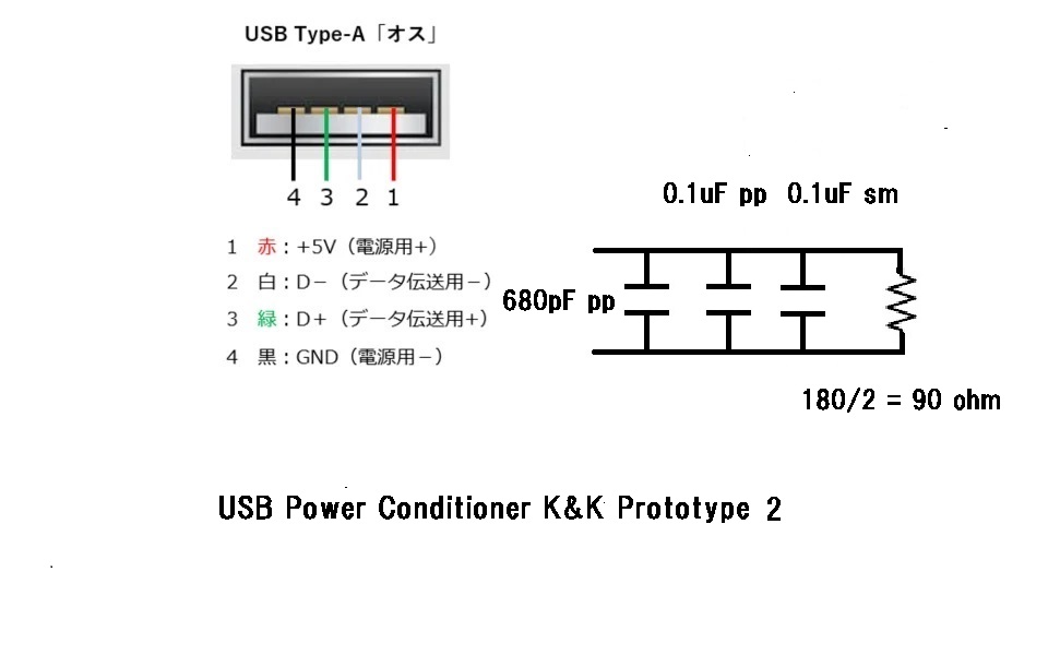 この最終試作はUSBコネクターの内部に680pFのポリプロピレン・フィルムのコンデンサを入れ短いケーブルを介して0.1μFの旧ソ連製のシルバーマイカコンデンサと0.1μFのポリプロピレン・フィルムコンデンサをパラにして5VとGND間に接続しています。