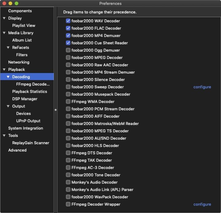 デコーダーは4つオンにしてますが、常用するのはWAVとCue Sheetだけです。FFmpegやDSPはすべてオフ。動作を軽くすればするほど音質はよくなります。