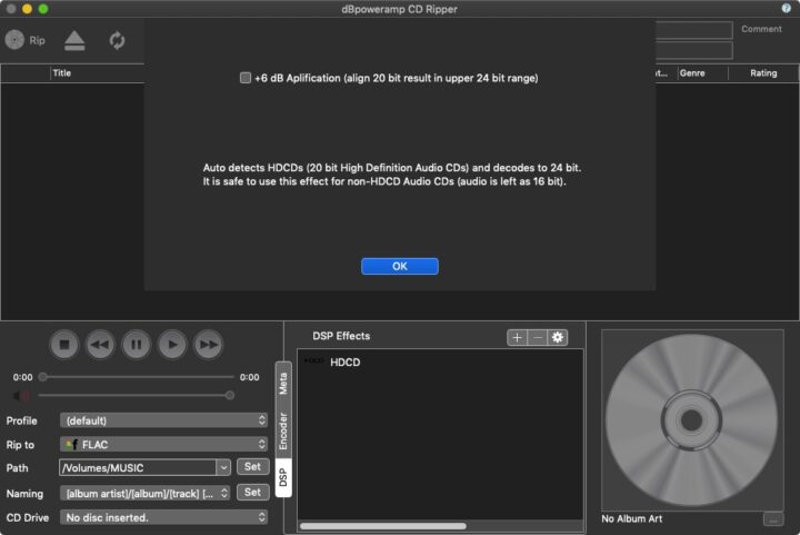 HDCDのデコードはdBpoweramp CD Ripperを使用。DSPのHDCD optionでは +6dB Amplification をオフにしています。そうしないとせっかくのピークエクステンションが相殺されてHDCDの意味がなくなると思います。そのかわり音量を2倍にする必要があります。
