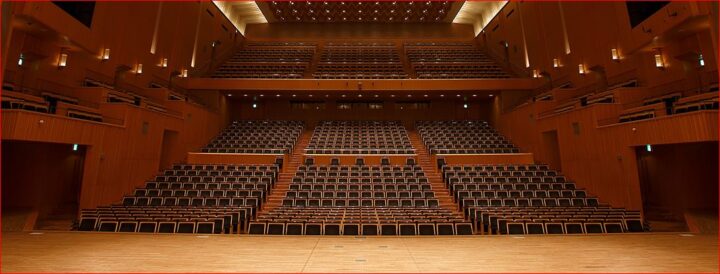 この多目的ホールはオーケストラピットを備えており、オペラ、バレエ、ミュージカルなど、さまざまな舞台芸術に対応します。日本初の吊り下げ式音響反射板を採用し、生の音の豊かな響きを重視したホールで、音響反射板は大編成・小編成の2パターンでの設置が可能。