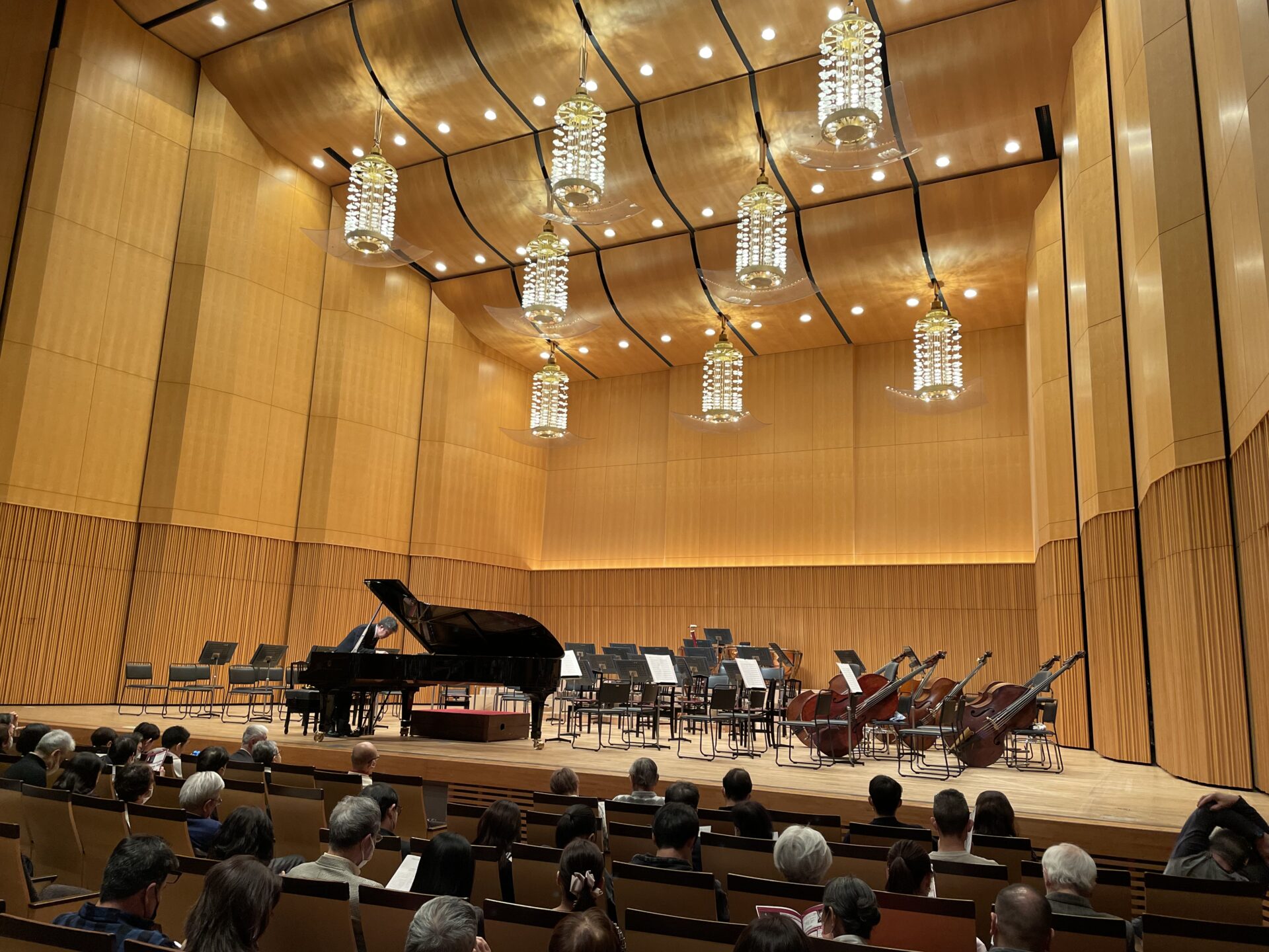 私の席からの眺め:後半のショパンに備えてピアノの調律をしているところ。