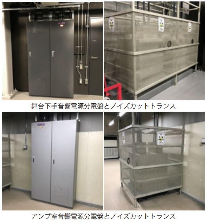 音響調整室、アンプ室、舞台袖などの各音響電源分電盤にノイズカットトランスを配置し、音響機器へ供給される電源ノイズを除去する工夫をした。ノイズカットトランスの容量は、音響調整室50kVA、アンプ室60kVA、舞台下手、上手各60kVAである。もちろん、音響信号用に音響専用接地である。
