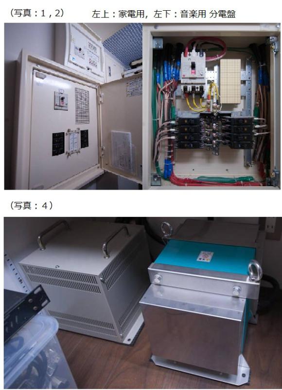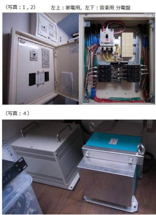 私の好みのスタジオ名を聞かれ答えた後、そのスタジオの電源構造を調べ、三菱とシーメンスの電源を聞き比べて、ケーブルも吟味してより近いサウンドになるよう選んでくれました。 ステップアップトランスとノイズカットトランスもマシンルーム内に備えており(写真:4)、スタジオ内の壁コンには、異なる電圧機器を即座に使用できるよう100V、115V、 120Vなど選択肢がすでに用意がされています。