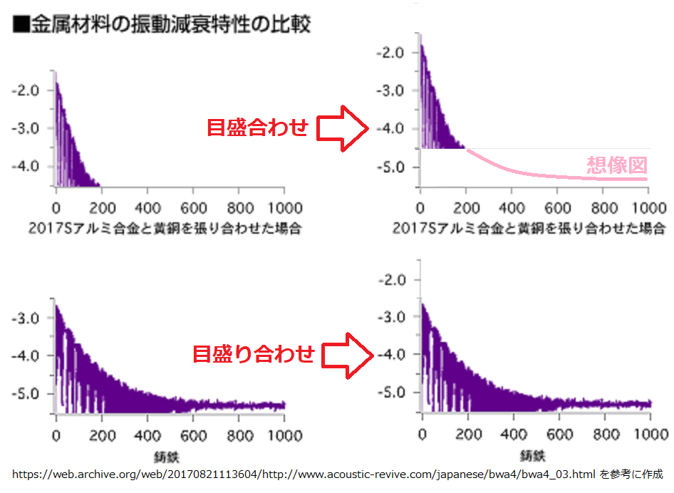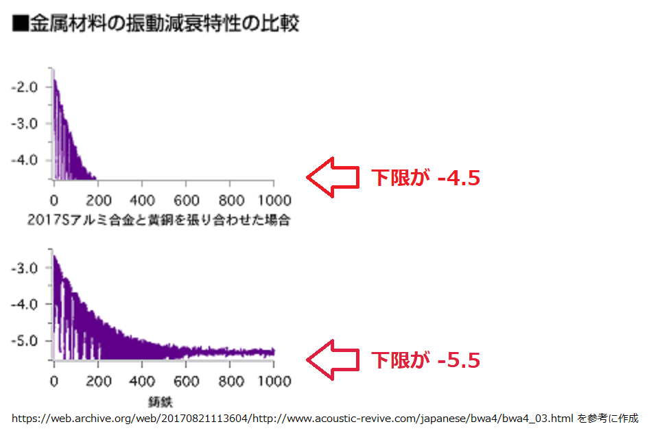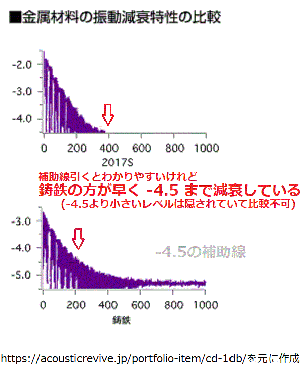 結論を言えば上記が誤解を生むグラフです。まるで鋳鉄の方が振動の収まりが悪そうです。