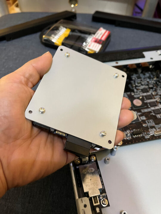 カーボンはRF/EMI遮断効果もあるので、ドライブケースにしてSSDを囲い、四方八方からノイズ対策を講じます↓