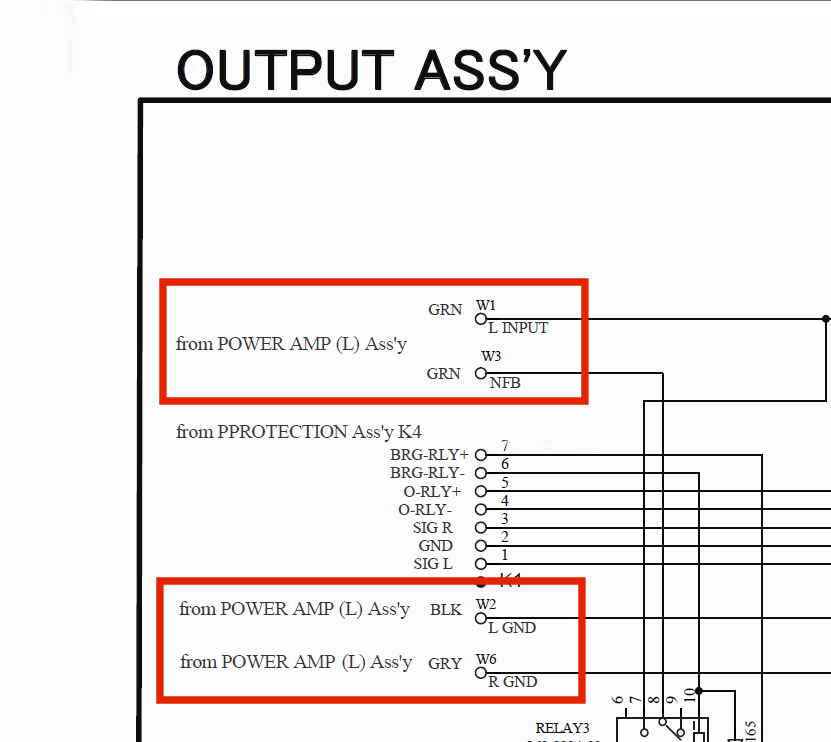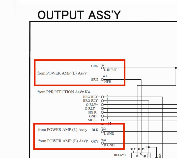 サービスマニュアルのブロック回路図によると、スピーカー出力基板への4Pピンアサインは、(「GND、+、NFB、GND」←ピン配列順)なので102SSCの同軸2芯×2で作れますが、パワーブロック側の2芯はブロックコンデンサーの端子にハンダ付けされているので、今回はハーネス作成を断念。