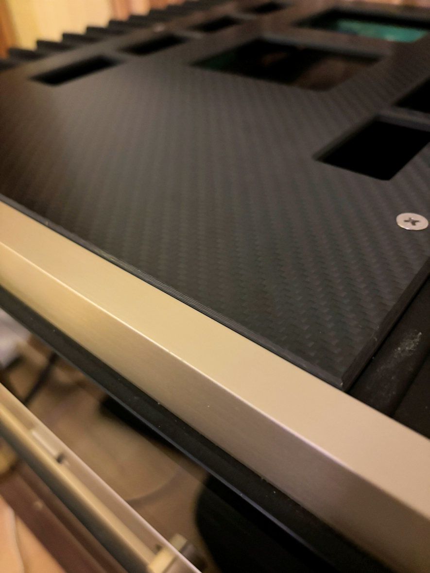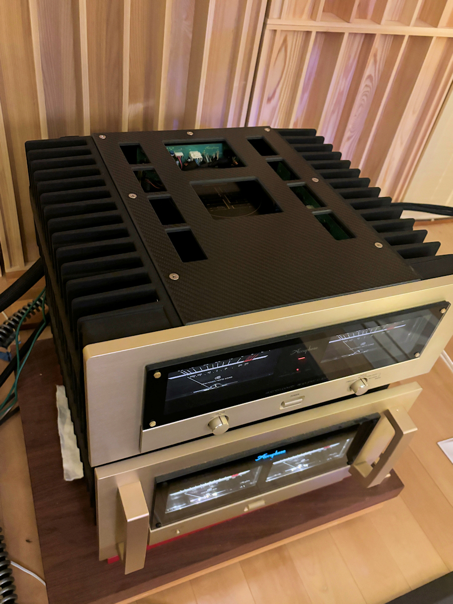 ただ、この時代のアキュフェーズの中堅パワーアンプは、肉厚トップパネルを付けるようには考慮されていないので、たかだか5mm厚のパネルでも少々、フロントパネルより浮き上がりますね↓