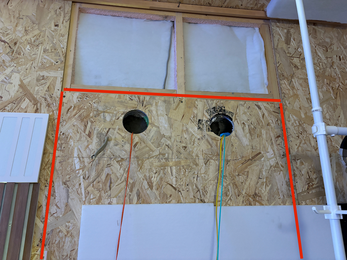 先日の防音換気扇のアルミ蛇腹ダクト周辺ですが、セメント配合エマルジョンパテで仕上げたところは、ほぼ壁一面(赤線部位)コンクリートを流し込みました↓