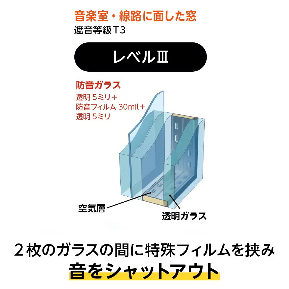防音ガラスをペアガラスにすると、さらに防音効果が高まります(必ず内外のガラス厚を変える事)。