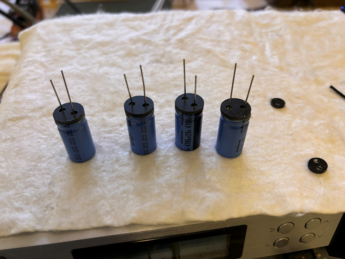 さらに、静電容量の大きいコンデンサーには、コンデンサー充電時のリード間振動による音質劣化防止のため、カーボン製コンデンサーインシュレーター(2t)を封入ゴム底面に装着しました↓