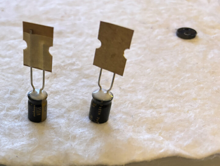 一応書いておきますが、カーボンは切断面に一部導通性があり、リードに接触させると端子短絡でコンデンサーが漏れなく爆発して危険なので、リードとカーボンの間隔を十分に採っておく必要があります。