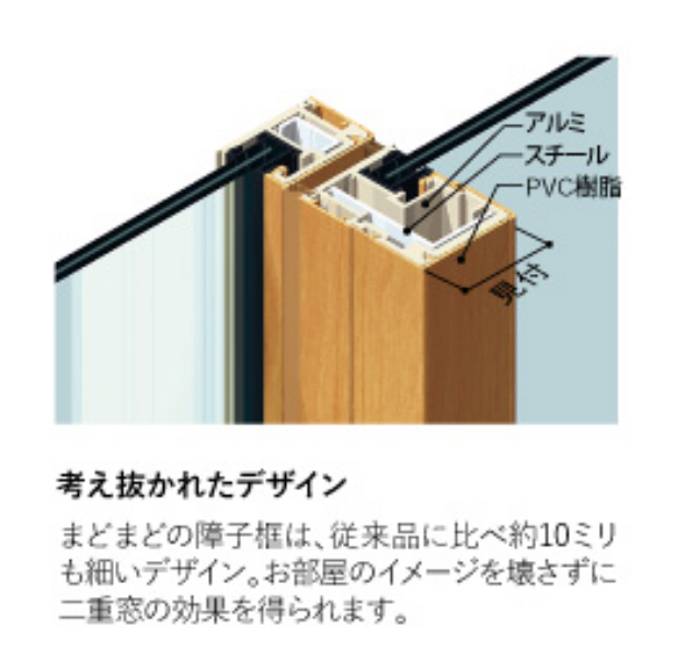 サッシ枠も、通常は内窓枠は樹脂製ですが、まどまどPlusは内部にアルミとスチールシャーシを内蔵し、通常の防音サッシでは難しい低音域のカットに貢献しているのだとか↓