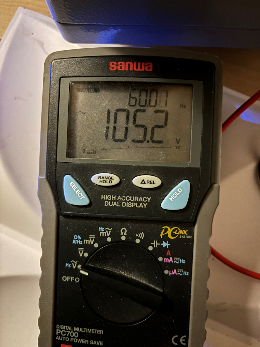 ・・・と、その前に、コンセントボックスの電圧を測ってみると105Vくらいでした↓