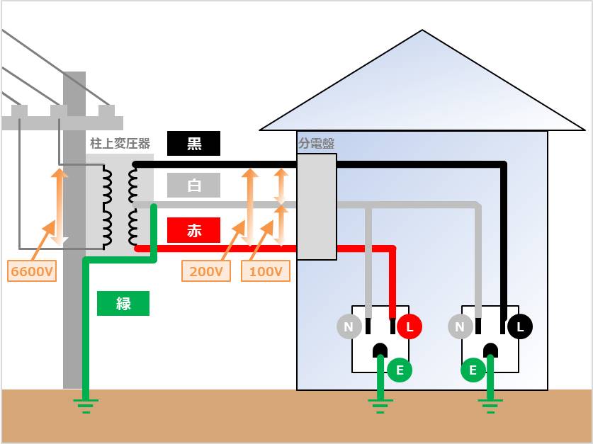 余談ですが、200VはCVケーブルの赤100V、黒100Vを使いますが、これをダウントランスで落とす場合、黒がLive、赤がNeutralになる事が多いです。