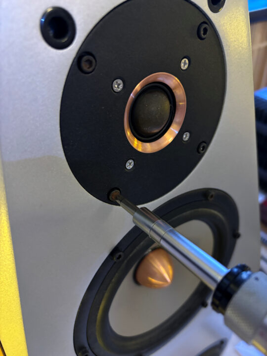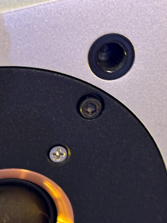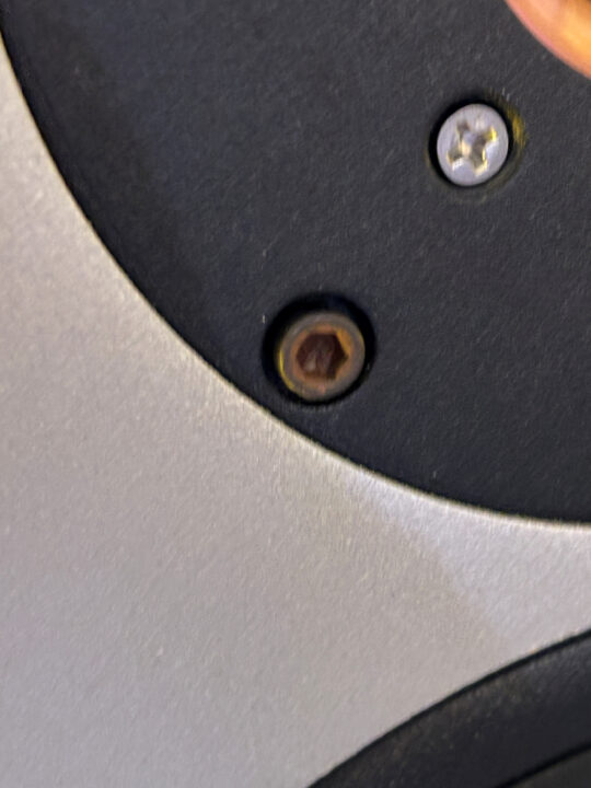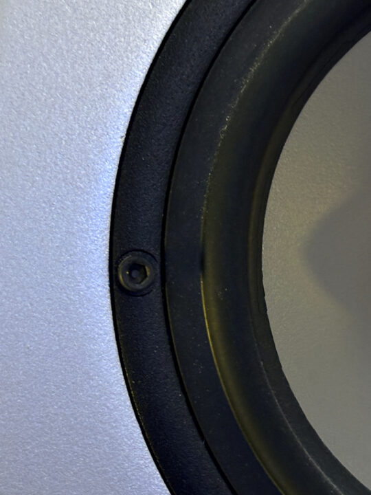 メインスピーカーのユニットをエンクロジャーに取り付けるネジですが、特に工具が掛かる部分に錆が発生しています(黄色枠丸↓)。