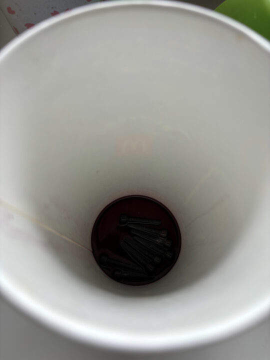 クリーナーを入れた紙コップごとシェイクすれば大抵は奇麗になりますが、錆が酷い場合はネジの頭部を歯ブラシ等で軽く擦ります。