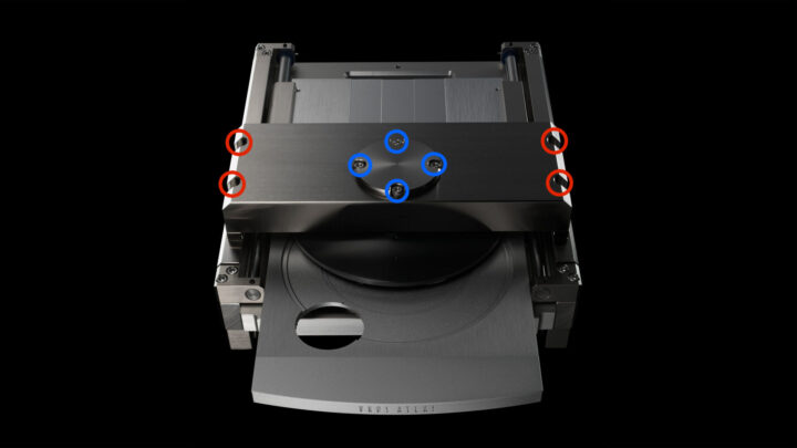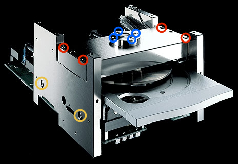 黄色丸のネジ交換は、10kg超の鉄塊ドライブを筐体から外し、RF基板からピックアップに繋がるリボンケーブルを撤去、一体型の場合は、電源部、DAC基板を外さないと取れない場合もあり、さらにドライブを横倒しにして交換しないといけないのでお勧めはしません。