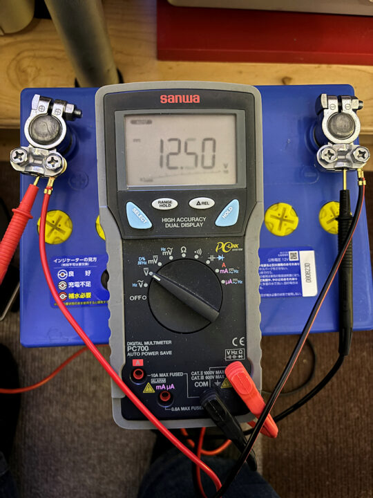 この時は12.5Vですが、満充電の電圧値はバッテリーメーカーによって違いがある様です。だいたい、満充電時12.6V以上が正常です。