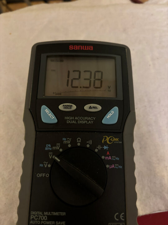 まず手始めに現状のバッテリー電圧を測定しますが、それがコレです(ほぼカラ状態からエンジン・アイドリングで1時間放置)↓