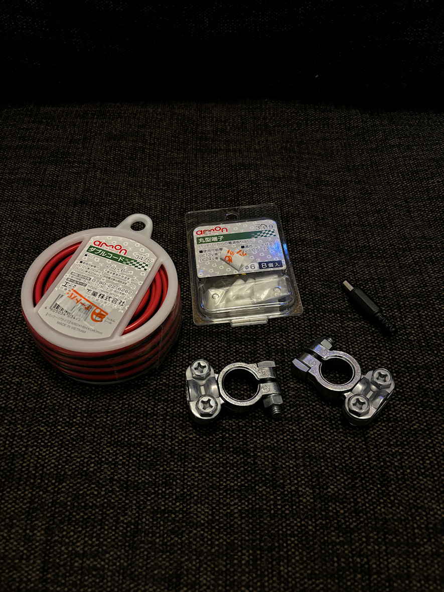 バッテリー駆動による本質を見極めたかったので、あえてケーブルは車用の一般的なパーツを使用しています。