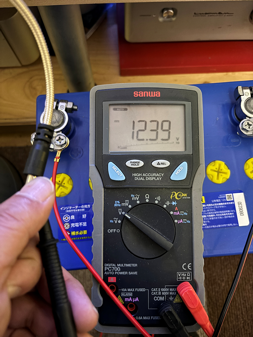 12.4Vを切ってからは何気に電圧が落ち難くなり、電源投入後5時間経過で12.33V(バッテリー容量規格は100D23L)。