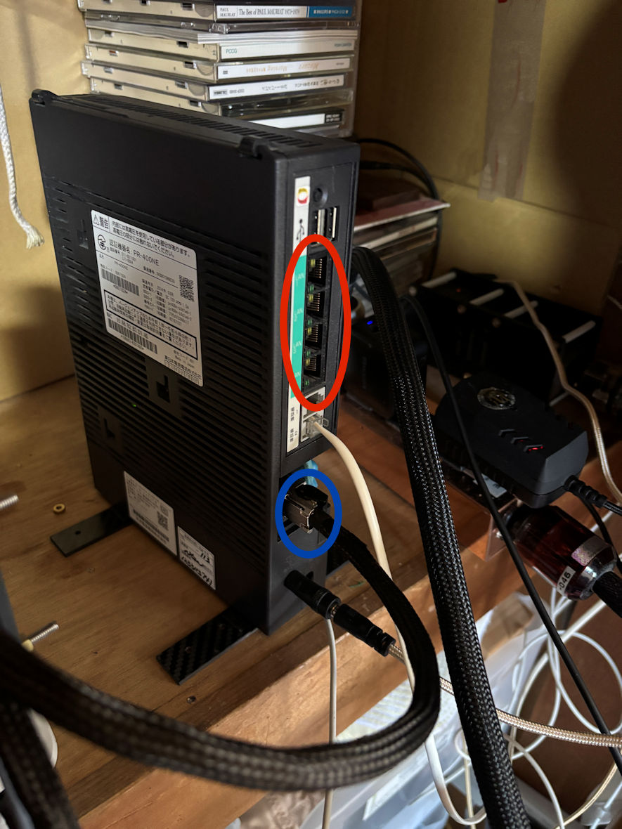 ↑赤丸部位が従来のONU内LANハブを介した接続場所で、青丸部位が、下段のSC光メディアコンバーター出力です。