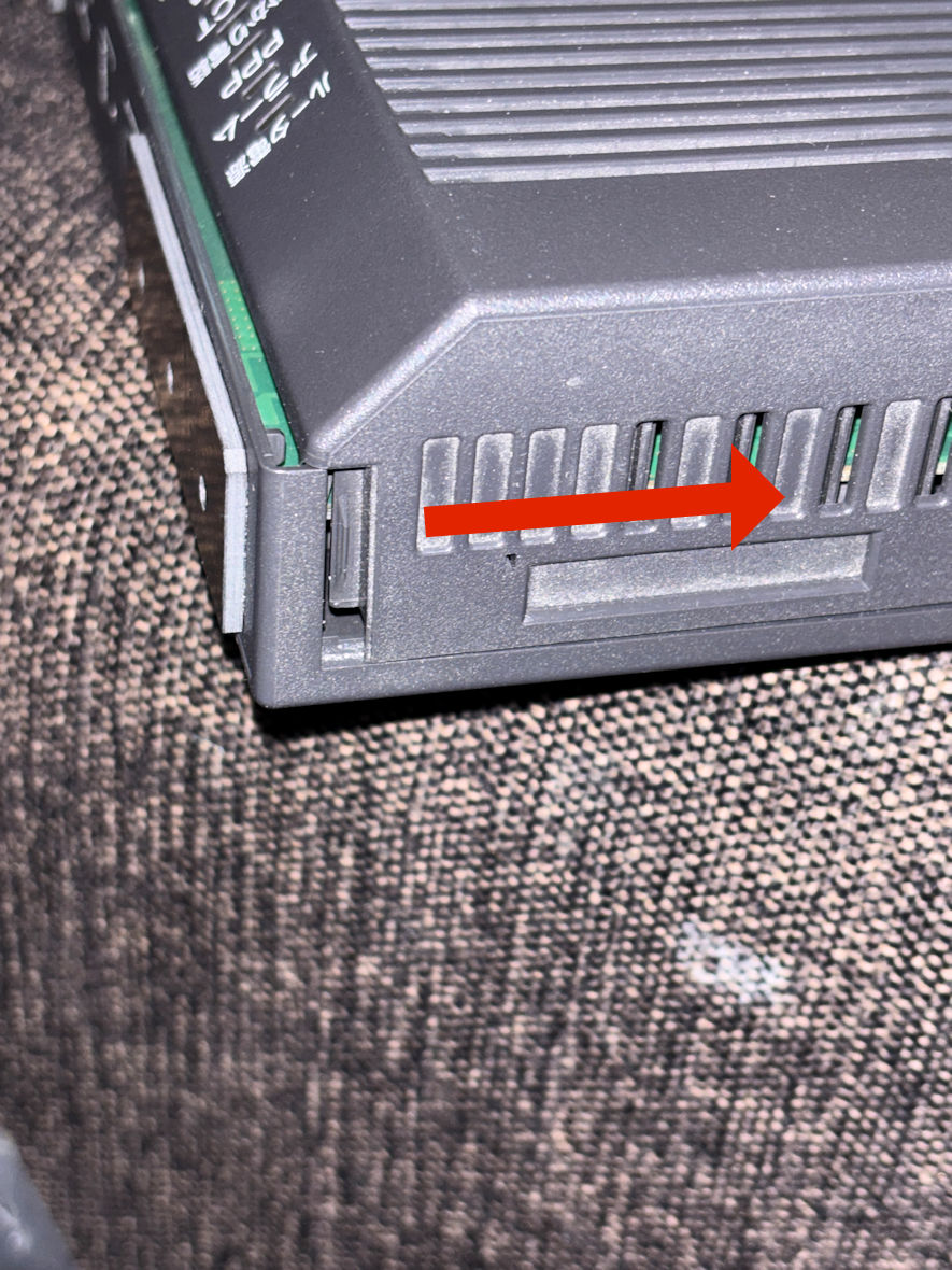 上段のLANハブのフロントカバーは、裏面のネジ2本(旧式の場合は裏1本、表1本)のネジを外し、カバーを赤矢印方向にスライドさせるとカバーが開きます↓