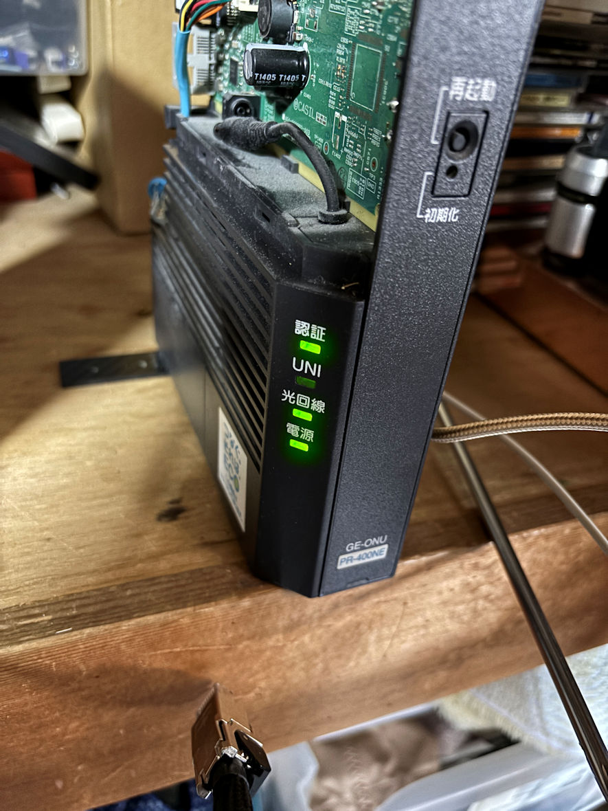 前回の画像では、ONUの下段である、SC光メディアコンバーターのRJ45出力の位置が分かり難いと友人に言われたので、ちょっと引き画像で取り直しました↓