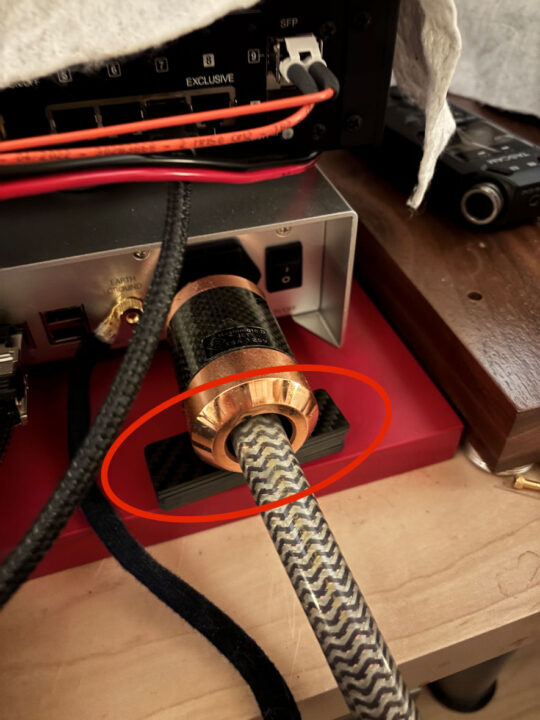 以前、カーボンパーツの発注単位を間違え、大量に届いてしまった余剰パーツを使い、オーディオボードから積層構造にして緩くて下へ傾いているプラグを支えて浮かせています↓