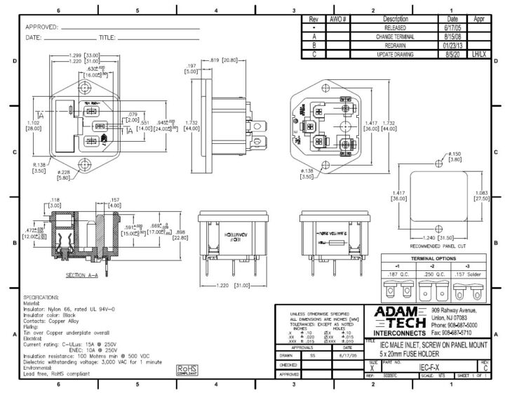 一応書いておきますが、ヒューズケース搭載型250V仕様IEC320インレットと、ヒューズ無し250V、または、国内仕様100V仕様IECインレットの各々は、機材パネル取り付けネジ穴ピッチもパネルカット孔も全く合わないので互換性はなく、交換は出来ません(ヒューズ無し250Vと100V仕様各々はネジピッチが同じ40㎜なので、他社製インレットに交換可な場合もある※非切り欠き型などの一部例外を除く)。