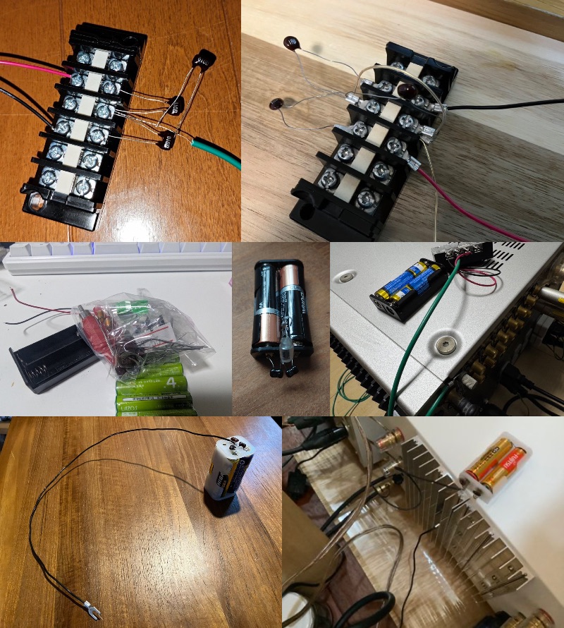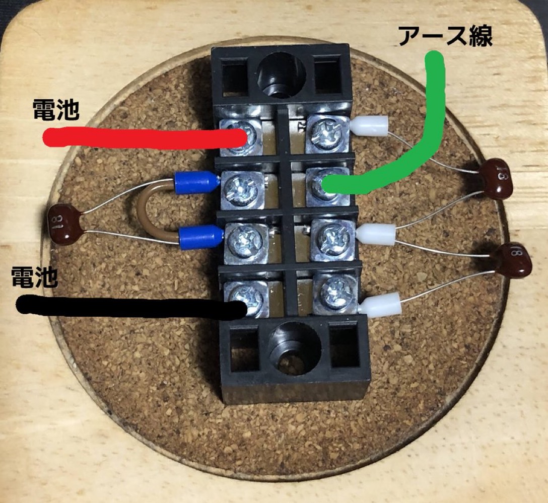 左から電池、マイカ×2、マイカ、アースの記号の所に機材を繋げる