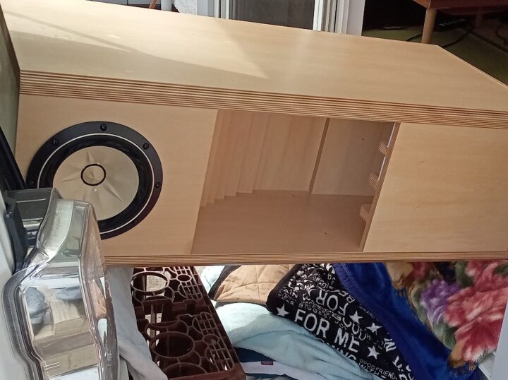 その翌日にぶらりと初めて立ち寄ったハードオフ古川東の店舗で新品同様のフォステクス20cmフルレンジユニットFE208EΣ(定価40,700円)が取り付けられた1本60kg超はありそうなバックロードホーンシステムに出会えたのは「運命的な何かが・・」と買い求めました。実質2シーターのソアラに積載スペースがないため、一旦、自宅に戻って今年2月末に納車されたばかりの新型エクストレイル(息子と折半し購入)で引き取ってきた頃には日も落ちたので、翌朝イチでエクストレイルの荷室から廃棄予定の布団などを重ねクッションに使って息子と慎重に降ろしました。現在使っているJBL4770Aも110kgも巨大で重かったのですが移動した際の実感としては21mm厚の合板2枚重ねで70kg近い重さが・・Googleアシスタントで写真を分析させたら断面の層の細かさと白く滑らかな木肌……これは間違いなく最高級の「フィンランドバーチ(白樺)合板」で現在の木材価格(特にフィンランドバーチ)と加工賃の高騰を考慮するとペアで25万円〜40万円以上になっても全くおかしくない弩級仕様とのこと・・(汗々)