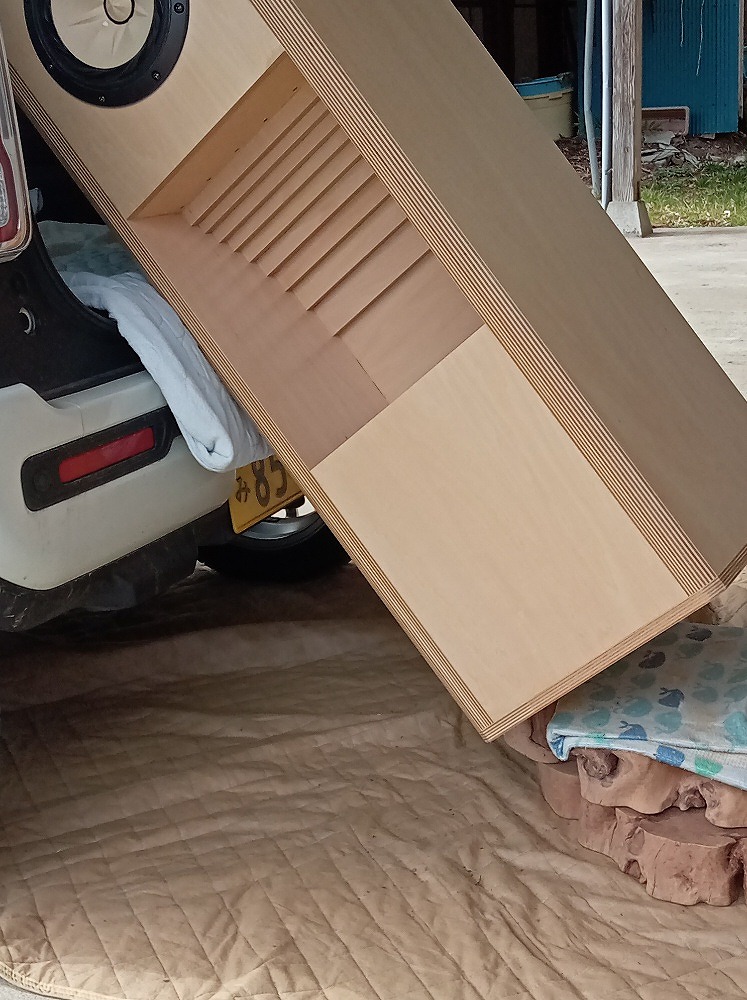 その翌日にぶらりと初めて立ち寄ったハードオフ古川東の店舗で新品同様のフォステクス20cmフルレンジユニットFE208EΣ(定価40,700円)が取り付けられた1本60kg超はありそうなバックロードホーンシステムに出会えたのは「運命的な何かが・・」と買い求めました。実質2シーターのソアラに積載スペースがないため、一旦、自宅に戻って今年2月末に納車されたばかりの新型エクストレイル(息子と折半し購入)で引き取ってきた頃には日も落ちたので、翌朝イチでエクストレイルの荷室から廃棄予定の布団などを重ねクッションに使って息子と慎重に降ろしました。現在使っているJBL4770Aも110kgも巨大で重かったのですが移動した際の実感としては21mm厚の合板2枚重ねで70kg近い重さが・・Googleアシスタントで写真を分析させたら断面の層の細かさと白く滑らかな木肌……これは間違いなく最高級の「フィンランドバーチ(白樺)合板」で現在の木材価格(特にフィンランドバーチ)と加工賃の高騰を考慮するとペアで25万円〜40万円以上になっても全くおかしくない弩級仕様とのこと・・(汗々)