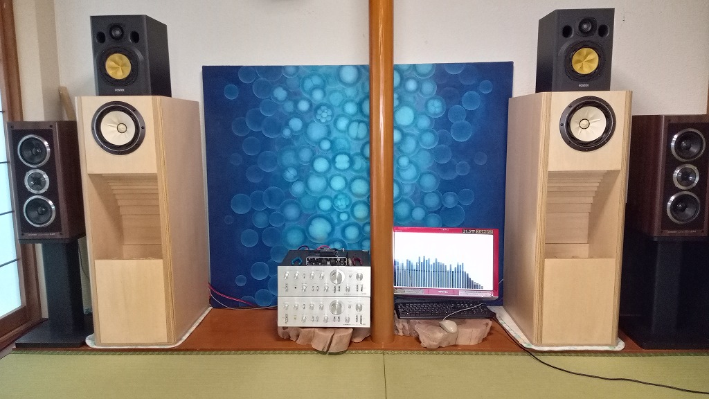 中央にFOSTEX FE208EΣのBH、その上に同社のNF-1。外側には専用台に乗せたパイオニアS-55Twin。アンプはSA-8800IIを2台積みし、Roland QUAD-CAPTURE(UA-55)を介してPCからwasapi接続。作業場では「暴れん坊」だったBHも、2時間かけ掃除したこの空間で鳴らすと畳の吸音も手伝ってか少しずつ落ち着きが出てきたようです。