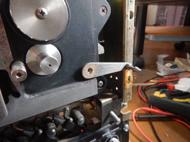 先ずは現状状況の確認からスタートしました。前回時期は不明ですが15年前くらいでしょうか、一度同デッキ使ってみようとしました。その時は絶不調でテープ速度は不安定、アンプからはノイズが出て全く駄目でした。で今回も同じく状態だろうと思いましたが、先ずは試さないと分かりません。切れたキャプスタンベルトを粘着テープで仮補修し駆動ベルトをセットしました。テープ走行を確認したところ、巻き上げ、巻き戻し、再生共に正常に動作します。回転数のチェックですが、テストテープを所持していませんので信頼性のあるテープでチェックしました。